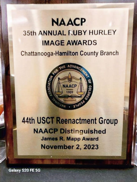 SDHS is proud to announce that on November 2, 2023, the 44th Regiment of United States Colored Troops Reenactment Group received an NAACP Image Award, from the Chattanooga-Hamilton County Branch, for their outstanding work as Civil War re-enactors. This award is a true testament to the dedication of its members, who strive to create an authentic and educational experience for all who attend their events. The group was founded 15 years ago by member Donald Tatum, and has 15 members.